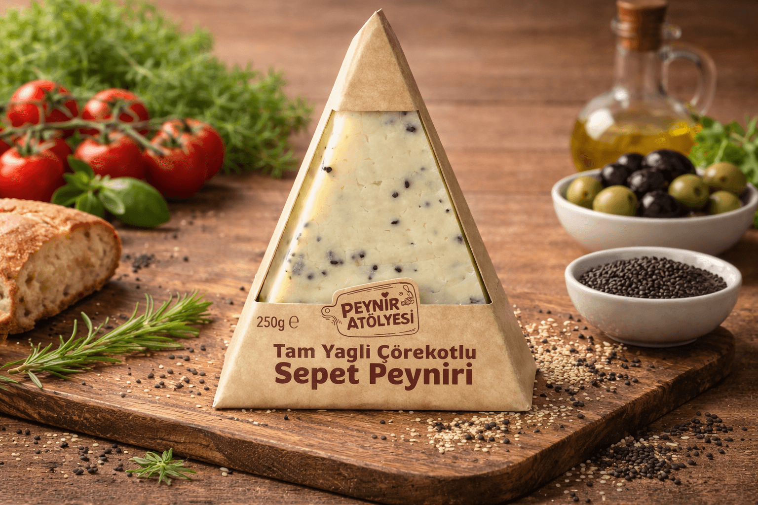 Peynir Atölyesi Tam Yağlı Çörekotlu Sepet Peyniri,çörekotunun kendine özgü aromasıyla zenginleştirilmiş özel bir peynir çeşididir. Sepet peyniri formu...